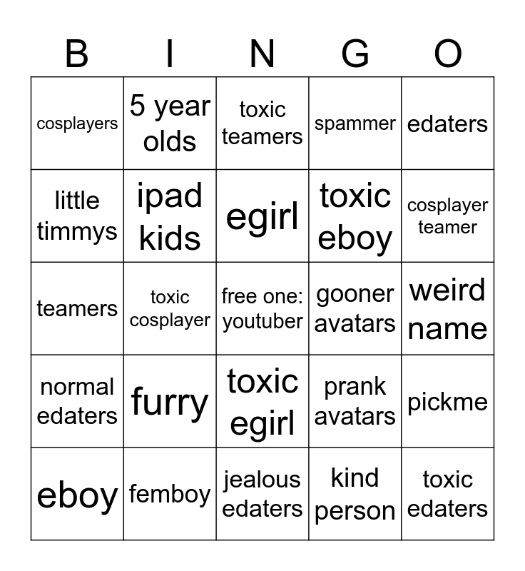 This bingo card has a free space and 24 words: furry, femboy, egirl, eboy, edaters, cosplayers, little timmys, 5 year olds, gooner avatars, toxic egirl, toxic eboy, teamers, prank avatars, pickme, ipad kids, kind person, weird name, toxic teamers, cosplayer teamer, toxic cosplayer, toxic edaters, normal edaters, spammer and jealous edaters.