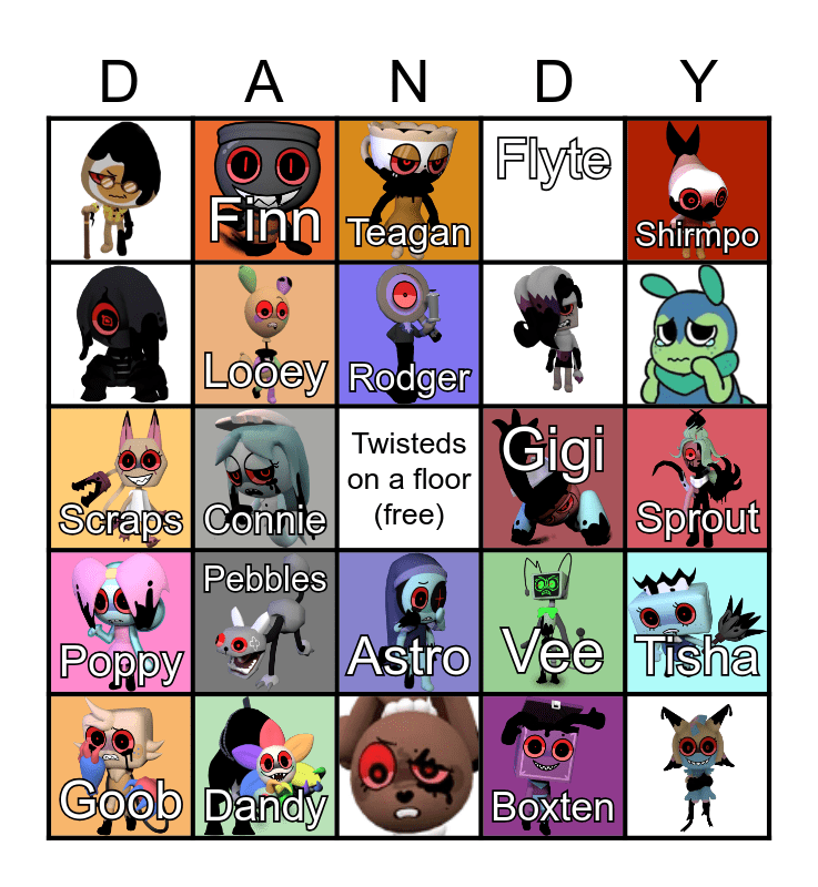 This bingo card has 31 images, a free space and 25 words: Boxten, Brightney, Connie, Cosmo, Poppy, Looey, Shirmpo, Tisha, Finn, RnD, Rodger, Teagan, Toodles, Flutter, Gigi, Glisten, Goob, Scraps, Astro, Pebbles, Vee, Shelly, Sprout, Dandy and Flyte.