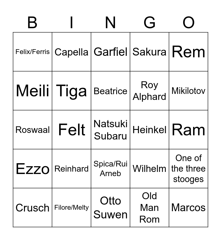 This bingo card has a free space and 24 words: Crusch, Reinhard, Beatrice, Old Man Rom, Rem, Felix/Ferris, Capella, Garfiel, Heinkel, Ram, Roswaal, Tiga, Wilhelm, One of the three stooges, Meili, Filore/Melty, Otto Suwen, Sakura, Mikilotov, Ezzo, Felt, Spica/Rui Arneb, Roy Alphard and Marcos.