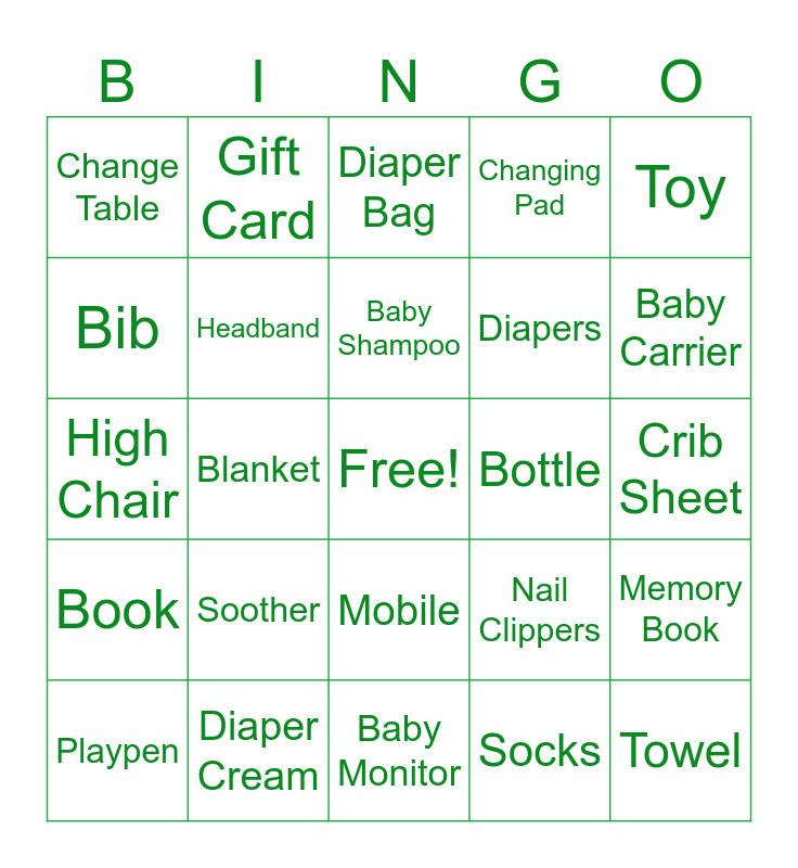 This bingo card has a free space and 29 words: Playpen, Baby Wipes, Blanket, Lotion, Change Table, Diaper Bag, Headband, Soother, Bottle, Diaper Cream, Crib Sheet, Towel, Baby Monitor, Socks, Baby Carrier, Hair Brush, Mobile, Book, Toy, High Chair, Nail Clippers, Onesie, Diapers, Bib, Changing Pad, Gift Card, Memory Book, Baby Shampoo and Sippy Cup.