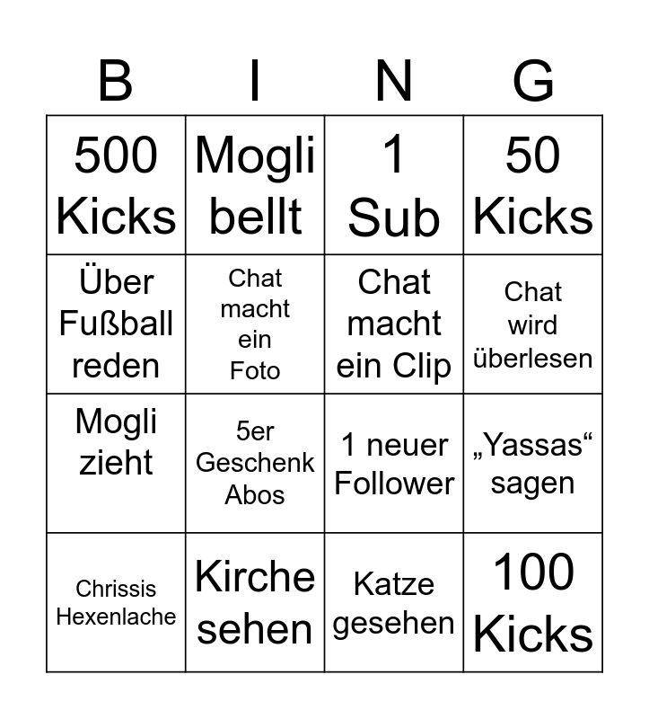 This bingo card has 16 words: Chrissis Hexenlache, Kirche sehen, 1 Sub, 50 Kicks, Über Fußball reden, Mogli bellt, 1 neuer Follower, „Yassas“ sagen, 500 Kicks, Chat macht ein Foto, Katze gesehen, Chat wird überlesen, Mogli zieht, 5er Geschenk Abos, Chat macht ein Clip and 100 Kicks.