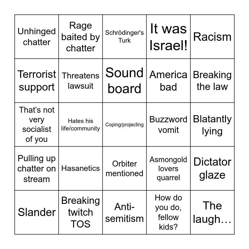 This bingo card has 25 words: Hasanetics, Anti-semitism, Sound board, Slander, Racism, Unhinged chatter, Terrorist support, Rage baited by chatter, Buzzword vomit, Orbiter mentioned, America bad, That’s not very socialist of you, Asmongold lovers quarrel, Dictator glaze, Threatens lawsuit, The laugh…, Blatantly lying, Schrödinger's Turk, Breaking the law, Hates his life/community, Coping/projecting, Breaking twitch TOS, Pulling up chatter on stream, It was Israel! and How do you do, fellow kids?.