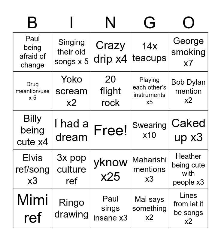 This bingo card has a free space and 24 words: 3x pop culture ref, Ringo drawing, 20 flight rock, Mimi ref, George smoking x7, Paul being afraid of change, Drug meantion/use x 5, Singing their old songs x 5, Swearing x10, yknow x25, Playing each other’s instruments x5, Billy being cute x4, Maharishi mentions x3, Heather being cute with people x3, Yoko scream x2, Mal says something x2, Caked up x3, Crazy drip x4, Bob Dylan mention x2, I had a dream, Lines from let it be songs x2, Elvis ref/song x3, 14x teacups and Paul sings insane x3.