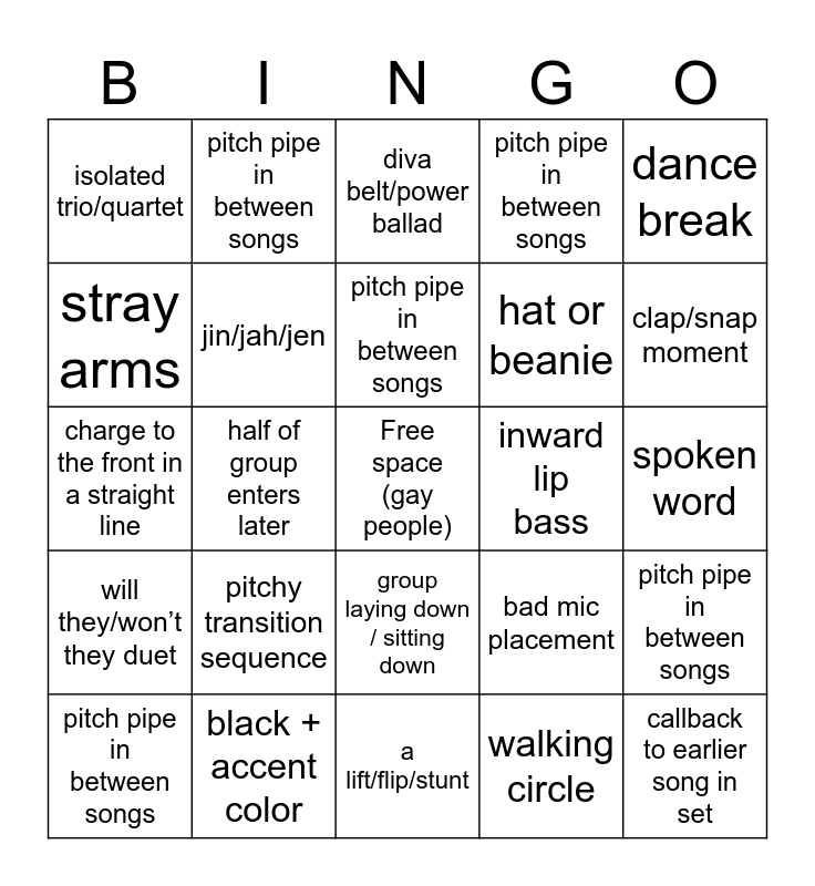 This bingo card has a free space and 29 words: pitch pipe in between songs, an ooh-wah slide, half of group enters later, box step, isolated trio/quartet, diva belt/power ballad, jin/jah/jen, pitchy transition sequence, inward lip bass, black + accent color, spoken word, callback to earlier song in set, a lift/flip/stunt, walking circle, clap/snap moment, unnecessary descant ?, group laying down / sitting down, will they/won’t they duet, dance break, charge to the front in a straight line, bad mic placement, off mic moment, hat or beanie, stray arms, pitch pipe in between songs, pitch pipe in between songs, pitch pipe in between songs, pitch pipe in between songs and pitch pipe in between songs.