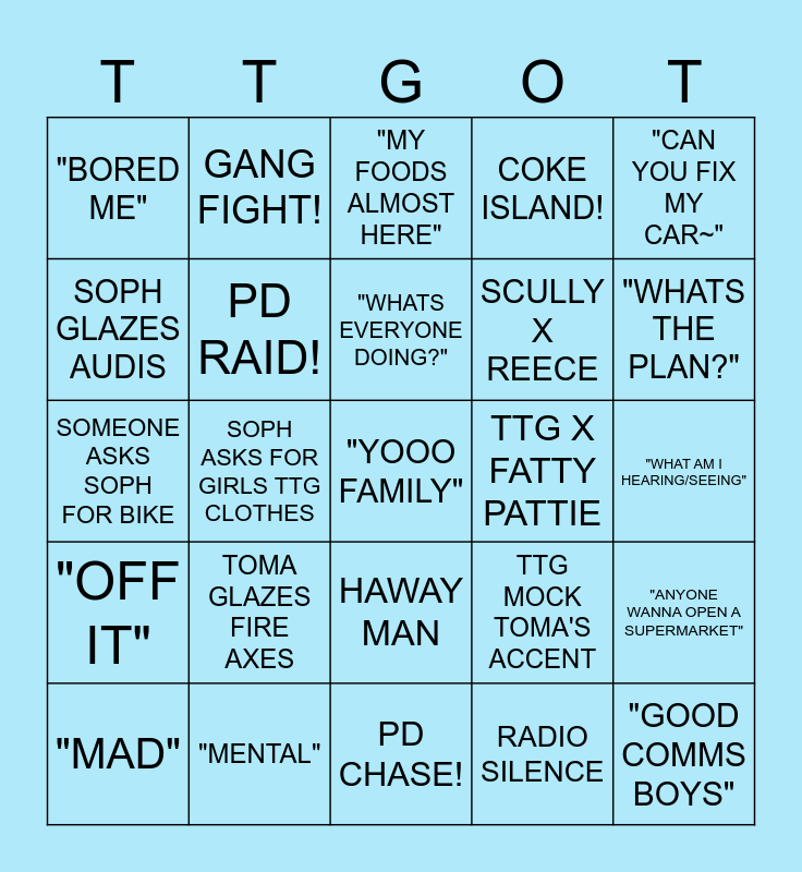 This bingo card has a free space and 29 words: "MAD", "T IS RINGING ME", SOPH ASKS FOR GIRLS TTG CLOTHES, "ADAMMMMM", "BORED ME", "MY FOODS ALMOST HERE", PD RAID!, TOMA GLAZES FIRE AXES, TTG X FATTY PATTIE, "MENTAL", "WHAT AM I HEARING/SEEING", "GOOD COMMS BOYS", PD CHASE!, RADIO SILENCE, "WHATS THE PLAN?", CHI IN DI AA, HAWAY MAN, "OFF IT", "CAN YOU FIX MY CAR~", SOMEONE ASKS SOPH FOR BIKE, TTG MOCK TOMA'S ACCENT, REECE FED PHONE CALL, SCULLY X REECE, SOPH GLAZES AUDIS, COKE ISLAND!, GANG FIGHT!, "ANYONE WANNA OPEN A SUPERMARKET", "WHATS EVERYONE DOING?" and SOMEONE GETS ARRESTED.