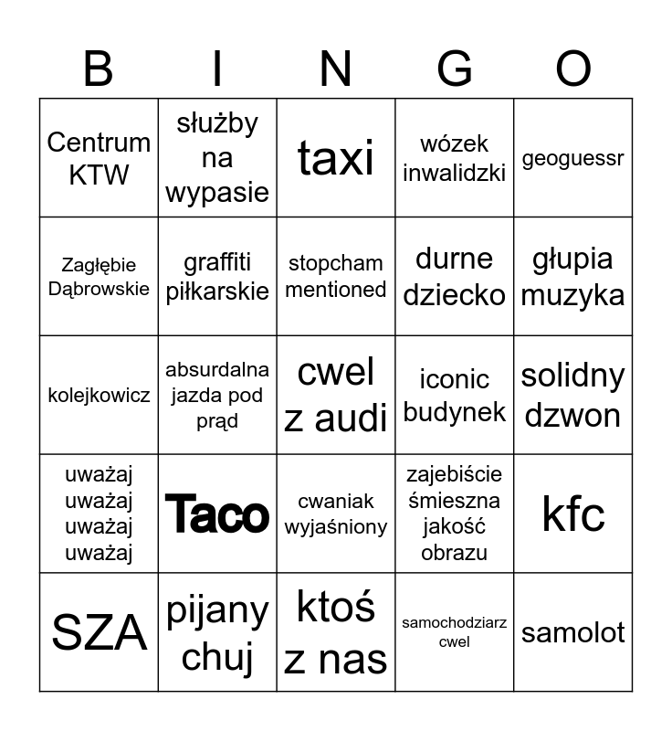 This bingo card has a free space and 24 words: Taco, pijany chuj, stopcham mentioned, SZA, geoguessr, Centrum KTW, Zagłębie Dąbrowskie, służby na wypasie, iconic budynek, cwaniak wyjaśniony, durne dziecko, kolejkowicz, zajebiście śmieszna jakość obrazu, kfc, graffiti piłkarskie, samochodziarz cwel, solidny dzwon, taxi, głupia muzyka, absurdalna jazda pod prąd, samolot, uważaj uważaj uważaj uważaj, wózek inwalidzki and ktoś z nas.