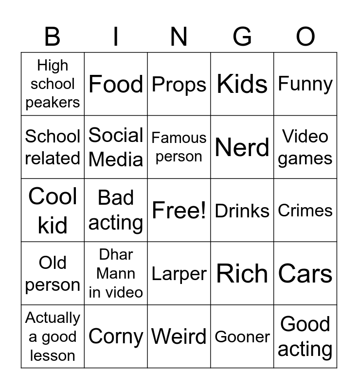 This bingo card has a free space and 24 words: Dhar Mann in video, Corny, Famous person, Actually a good lesson, Funny, High school peakers, School related, Food, Drinks, Larper, Nerd, Cool kid, Rich, Cars, Social Media, Gooner, Crimes, Props, Video games, Bad acting, Good acting, Old person, Kids and Weird.