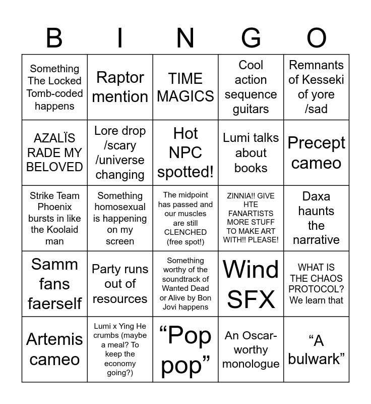 This bingo card has a free space and 54 words: The Connie Cliffhanger, Samm fans faerself, Someone heals a hit point, Someone loses a hit point, Something worthy of the soundtrack of Wanted Dead or Alive by Bon Jovi happens, Emotional guitars, Cool action sequence guitars, Xainan being a tired father, AZALÏS RADE MY BELOVED, KIMANI?!, Something The Locked Tomb-coded happens, Seirmièra crumbs, Lumi x Ying He crumbs (maybe a meal? To keep the economy going?), Artemis cameo, Flashback, “Pop pop”, “A bulwark”, Lumi talks about books, Sing haunts the narrative, Daxa haunts the narrative, Wind SFX, Cold open, ZINNIA!! GIVE HTE FANARTISTS MORE STUFF TO MAKE ART WITH!! PLEASE!, Remnants of Kesseki of yore /sad, Remnants of Kesseki of yore /cool, Raptor mention, Parental problems, Sea screams/ barks in chat /lh, A screenshot-worthy reaction, An Oscar-worthy monologue, Hunting sequence, We use film theory things (we cut to, shot descriptions, etc), Glitches mention, The Big Red X, TIME MAGICS, Someone puts up a sign, Strike Team Phoenix bursts in like the Koolaid man, WHAT IS THE CHAOS PROTOCOL? We learn that, Lore drop /cool, Lore drop /scary /universe changing, Raja-Yeowang Mining Corporation mention (I come in with a steel chair), Seir gets an omen, Music is so good! Sea is doing the turn tables one handed and they’re doing GREAT, Party gains resources, Party runs out of resources, Someone calls Xainan a bottom, Seir’s mood antlers change colour, Cat spotted! (seen/heard), Hot NPC spotted!, Something homosexual is happening on my screen, Precept cameo, Natural 20.., YAY! A ONE! and Ying He does shadow magic.