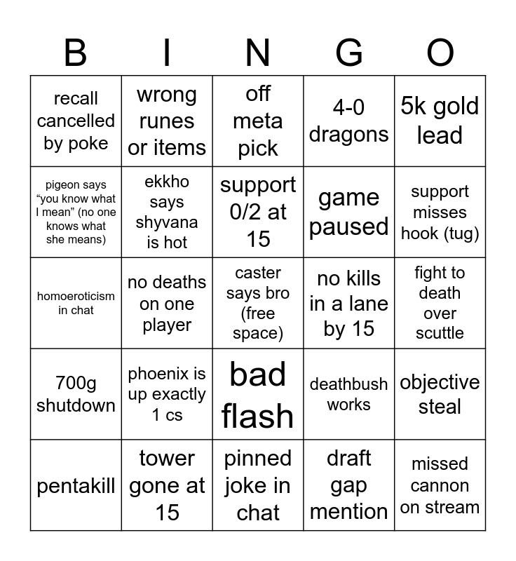 This bingo card has a free space and 24 words: pentakill, phoenix is up exactly 1 cs, support 0/2 at 15, draft gap mention, 5k gold lead, recall cancelled by poke, wrong runes or items, off meta pick, no kills in a lane by 15, fight to death over scuttle, homoeroticism in chat, ekkho says shyvana is hot, deathbush works, objective steal, pigeon says “you know what I mean” (no one knows what she means), tower gone at 15, pinned joke in chat, 4-0 dragons, support misses hook (tug), 700g shutdown, no deaths on one player, bad flash, game paused and missed cannon on stream.