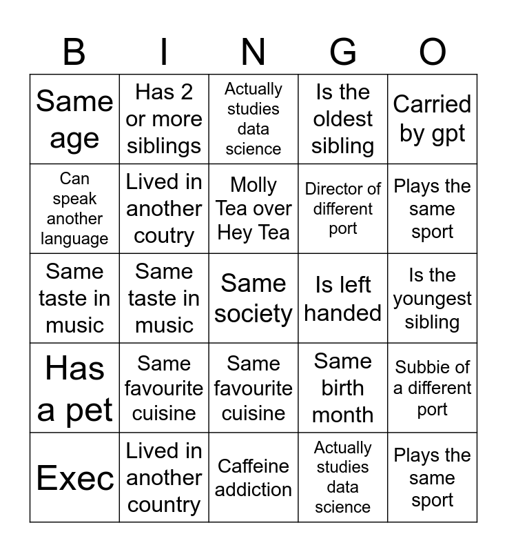 This bingo card has a free space and 49 words: Same degree, Plays the same sport, Exec, Caffeine addiction, Same favourite cuisine, Has a pet, Has 2 or more siblings, Can do a backflip (or cartwheel), Can speak another language, Knows someone famous, Lived in another coutry, Is the oldest sibling, Subbie of a different port, Same birth month, Is the youngest sibling, Can whistle, Molly Tea over Hey Tea, Is left handed, Loves Matcha, Carried by gpt, Same taste in music, Actually studies data science, Same age, Director of different port, Same degree, Plays the same sport, Exec, Caffeine addiction, Same favourite cuisine, Has a pet, Has 2 or more siblings, Can do a backflip, Can speak a different language, Knows someone famous, Lived in another country, Is the oldest sibling, Same society!, Same birth month, Is the youngest sibling, Can whistle, Molly tea over Hey tea, Is left handed, Loves matcha, Carried by gpt, Same taste in music, Actually studies data science, Same age, Director of a different port and Subbie of a different port.