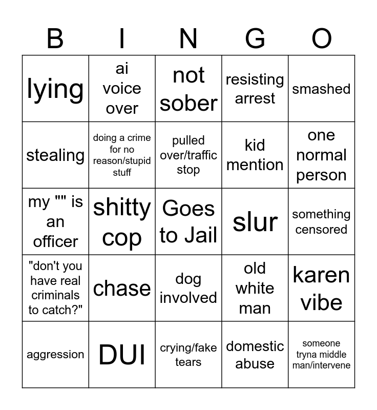 This bingo card has a free space and 24 words: chase, DUI, pulled over/traffic stop, aggression, smashed, lying, stealing, ai voice over, slur, dog involved, kid mention, my "" is an officer, old white man, karen vibe, doing a crime for no reason/stupid stuff, domestic abuse, something censored, not sober, one normal person, shitty cop, someone tryna middle man/intervene, "don't you have real criminals to catch?", resisting arrest and crying/fake tears.