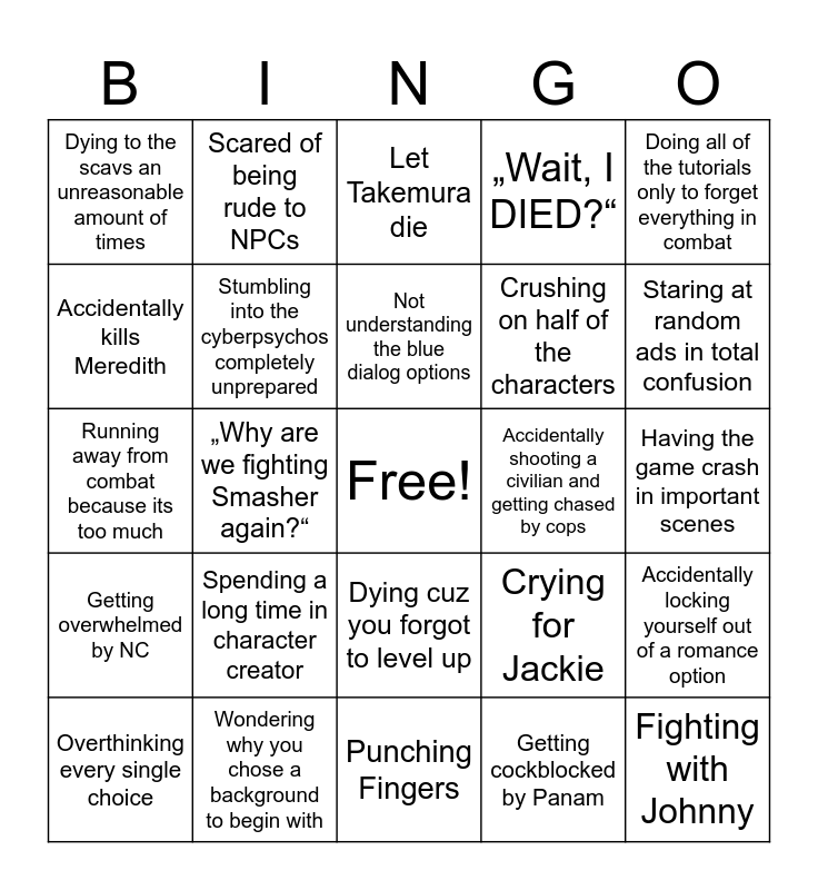 This bingo card has a free space and 24 words: Spending a long time in character creator, Wondering why you chose a background to begin with, Not understanding the blue dialog options, Overthinking every single choice, Doing all of the tutorials only to forget everything in combat, Dying to the scavs an unreasonable amount of times, Accidentally kills Meredith, Scared of being rude to NPCs, Accidentally shooting a civilian and getting chased by cops, Dying cuz you forgot to level up, Crushing on half of the characters, Running away from combat because its too much, Crying for Jackie, Accidentally locking yourself out of a romance option, Stumbling into the cyberpsychos completely unprepared, Getting cockblocked by Panam, Having the game crash in important scenes, Let Takemura die, Staring at random ads in total confusion, „Why are we fighting Smasher again?“, Fighting with Johnny, Getting overwhelmed by NC, „Wait, I DIED?“ and Punching Fingers.