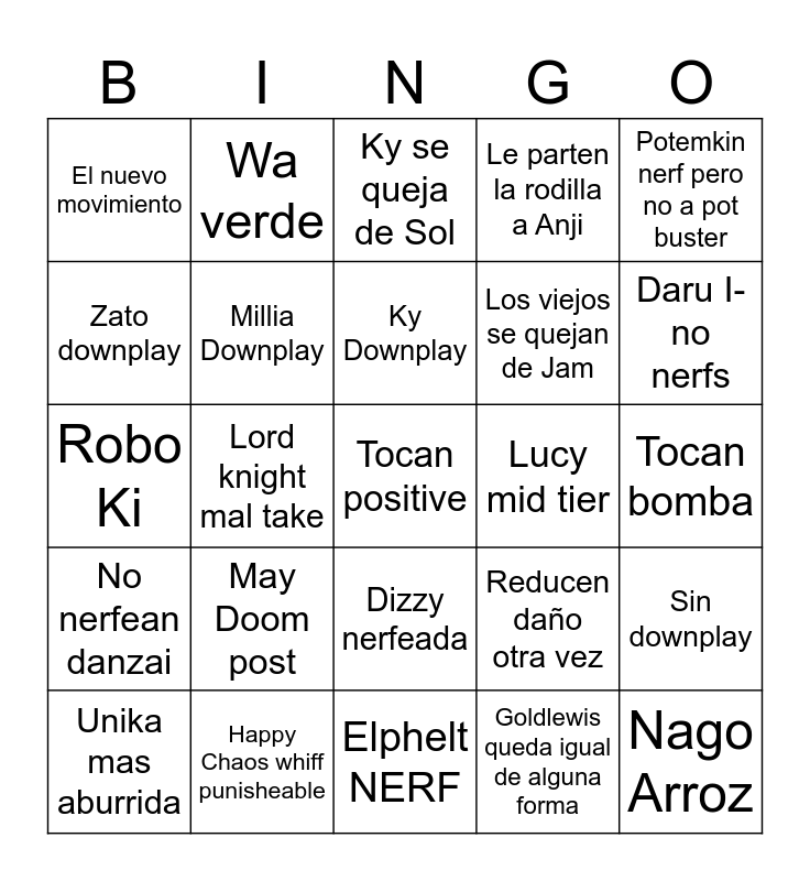 This bingo card has a free space and 24 words: May Doom post, Happy Chaos whiff punisheable, Ky Downplay, Unika mas aburrida, Potemkin nerf pero no a pot buster, El nuevo movimiento, Zato downplay, Wa verde, Lucy mid tier, Dizzy nerfeada, Los viejos se quejan de Jam, Robo Ki, Reducen daño otra vez, Sin downplay, Millia Downplay, Goldlewis queda igual de alguna forma, Tocan bomba, Ky se queja de Sol, Daru I-no nerfs, Lord knight mal take, Nago Arroz, No nerfean danzai, Le parten la rodilla a Anji and Elphelt NERF.