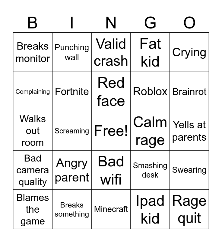 This bingo card has a free space and 24 words: Angry parent, Breaks something, Red face, Blames the game, Crying, Breaks monitor, Complaining, Punching wall, Calm rage, Bad wifi, Roblox, Walks out room, Smashing desk, Swearing, Fortnite, Ipad kid, Yells at parents, Valid crash, Brainrot, Screaming, Rage quit, Bad camera quality, Fat kid and Minecraft.