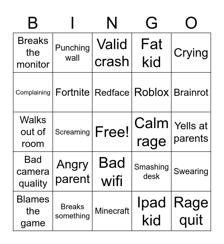 This bingo card has a free space and 24 words: Angry parent, Breaks something, Redface, Blames the game, Crying, Breaks the monitor, Complaining, Punching wall, Calm rage, Bad wifi, Roblox, Walks out of room, Smashing desk, Swearing, Fortnite, Ipad kid, Yells at parents, Valid crash, Brainrot, Screaming, Rage quit, Bad camera quality, Fat kid and Minecraft.