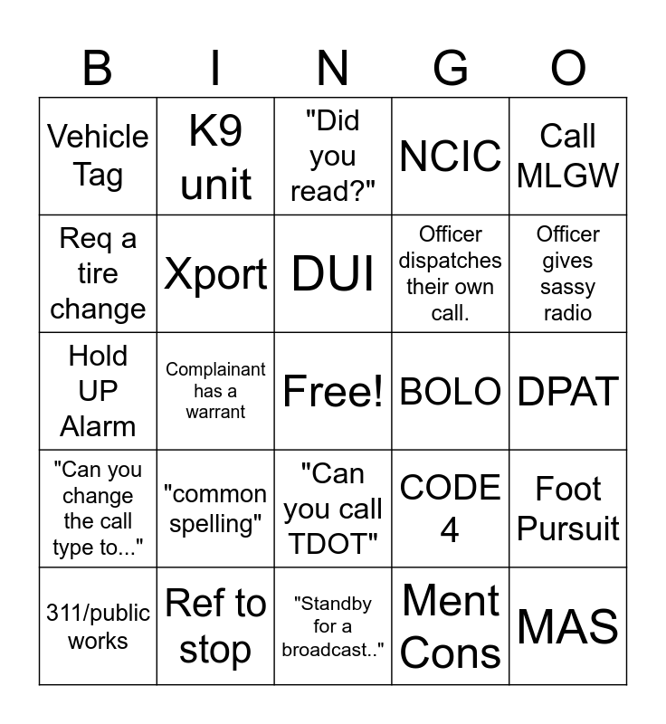 This bingo card has a free space and 24 words: "common spelling", Ref to stop, DUI, 311/public works, Call MLGW, Vehicle Tag, Req a tire change, K9 unit, BOLO, "Can you call TDOT", Officer dispatches their own call., Hold UP Alarm, CODE 4, Foot Pursuit, Xport, Ment Cons, DPAT, "Did you read?", Officer gives sassy radio, Complainant has a warrant, MAS, "Can you change the call type to...", NCIC and "Standby for a broadcast..".