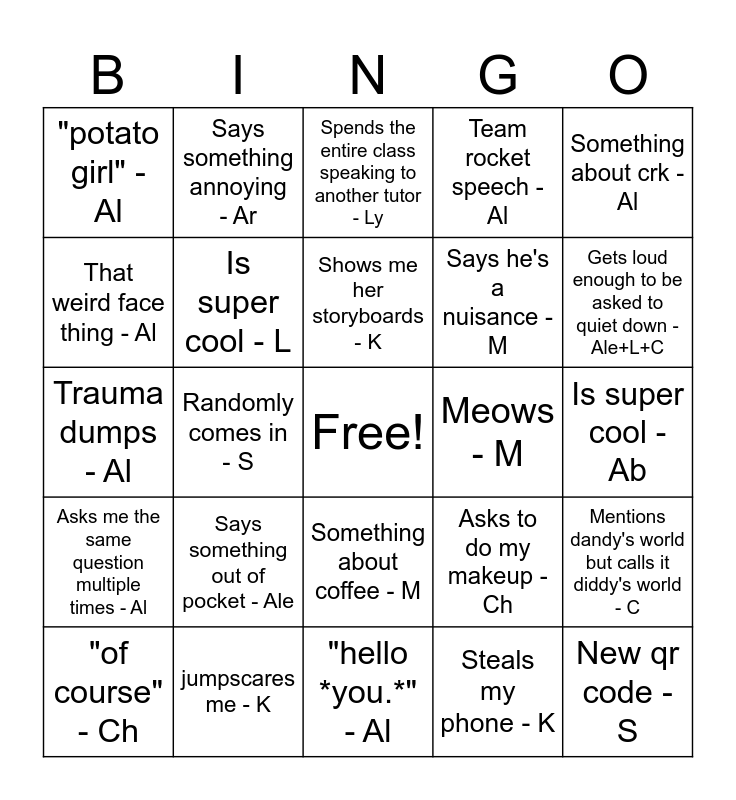 This bingo card has a free space and 24 words: Says something out of pocket - Ale, jumpscares me - K, Shows me her storyboards - K, "of course" - Ch, Something about crk - Al, "potato girl" - Al, That weird face thing - Al, Says something annoying - Ar, Meows - M, Something about coffee - M, Says he's a nuisance - M, Trauma dumps - Al, Asks to do my makeup - Ch, Mentions dandy's world but calls it diddy's world - C, Is super cool - L, Steals my phone - K, Is super cool - Ab, Spends the entire class speaking to another tutor - Ly, Gets loud enough to be asked to quiet down - Ale+L+C, Randomly comes in - S, New qr code - S, Asks me the same question multiple times - Al, Team rocket speech - Al and "hello *you.*" - Al.