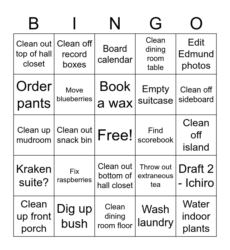 This bingo card has a free space and 28 words: Draft 2 - Ichiro, Draft 2 - Pinoe, Empty suitcase, Wash laundry, Order pants, Board calendar, Clean off record boxes, Kraken suite?, Find scorebook, Clean up front porch, Clean up mudroom, Clean dining room table, Dig up bush, Clean dining room floor, Clean off sideboard, Fix trellis, Fix raspberries, Move blueberries, Book a wax, Clean out bottom of hall closet, Clean out top of hall closet, Tidy banana plants, Water indoor plants, Clean out snack bin, Clean off island, Throw out extraneous tea, Edit Edmund photos and Dry laundry.