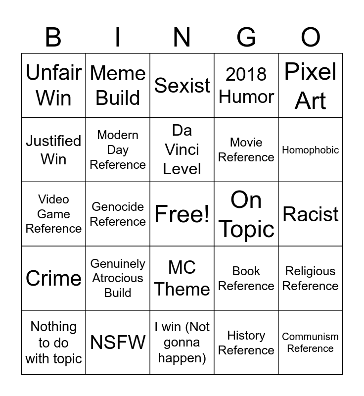 This bingo card has a free space and 24 words: Genuinely Atrocious Build, NSFW, Da Vinci Level, Nothing to do with topic, Pixel Art, Unfair Win, Justified Win, Meme Build, On Topic, MC Theme, Movie Reference, Video Game Reference, Book Reference, Religious Reference, Modern Day Reference, History Reference, Racist, Sexist, Homophobic, Genocide Reference, Communism Reference, Crime, 2018 Humor and I win (Not gonna happen).