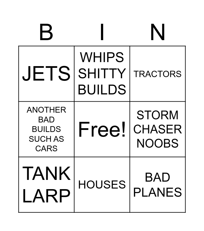 This bingo card has a free space and 8 words: STORM CHASER NOOBS, TRACTORS, WHIPS SHITTY BUILDS, TANK LARP, JETS, BAD PLANES, ANOTHER BAD BUILDS SUCH AS CARS and HOUSES.