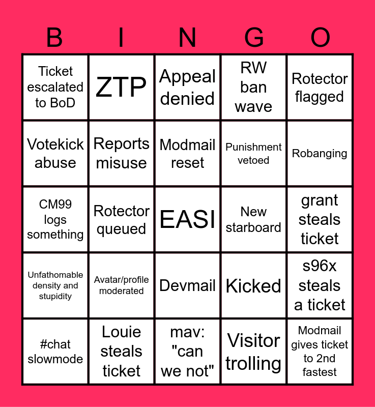 This bingo card has a free space and 24 words: Avatar/profile moderated, Louie steals ticket, Modmail reset, #chat slowmode, Rotector flagged, Ticket escalated to BoD, Votekick abuse, ZTP, New starboard, Devmail, Punishment vetoed, CM99 logs something, Kicked, s96x steals a ticket, Reports misuse, Visitor trolling, grant steals ticket, Appeal denied, Robanging, Rotector queued, Modmail gives ticket to 2nd fastest, Unfathomable density and stupidity, RW ban wave and mav: "can we not".