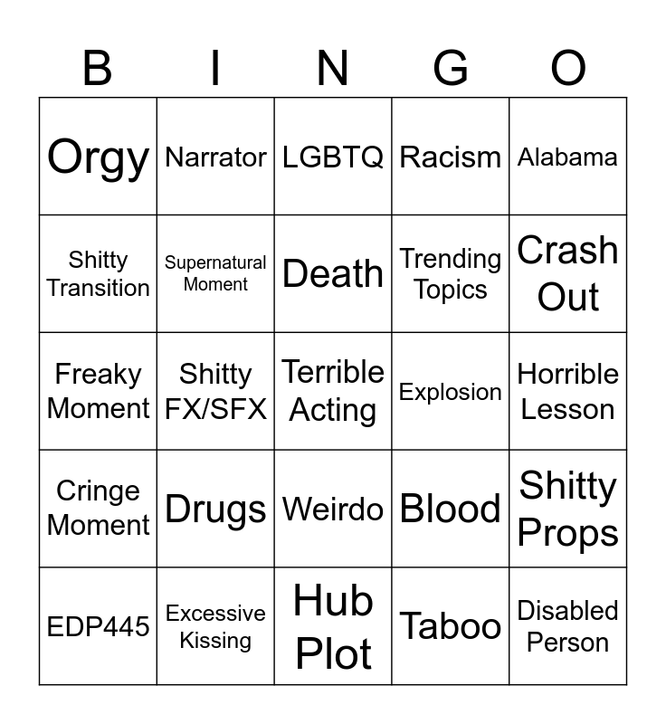 This bingo card has a free space and 24 words: Drugs, Excessive Kissing, Death, EDP445, Alabama, Orgy, Shitty Transition, Narrator, Explosion, Weirdo, Trending Topics, Freaky Moment, Blood, Shitty Props, Supernatural Moment, Taboo, Horrible Lesson, LGBTQ, Crash Out, Shitty FX/SFX, Disabled Person, Cringe Moment, Racism and Hub Plot.