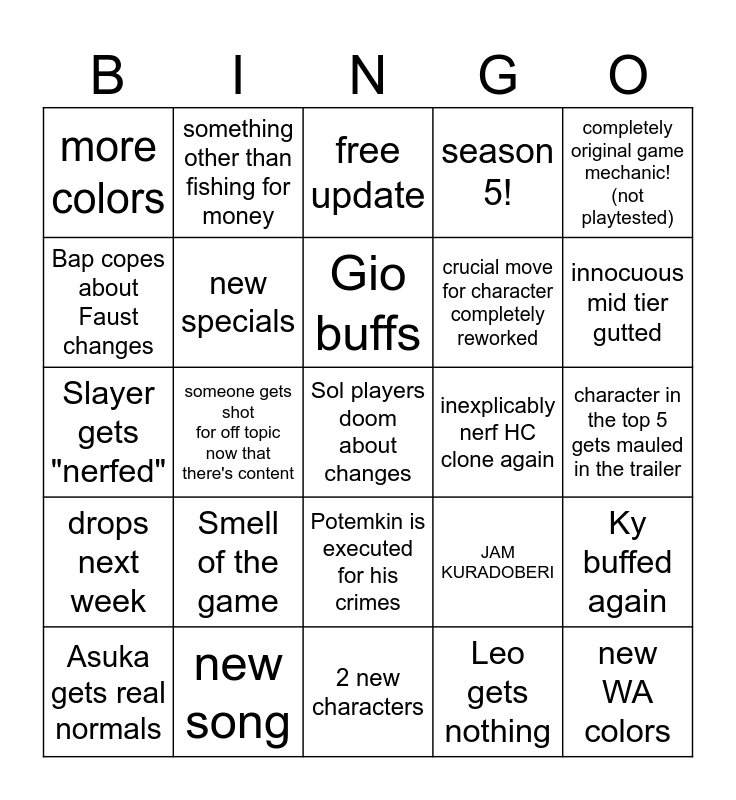 This bingo card has a free space and 24 words: Smell of the game, new song, Gio buffs, Asuka gets real normals, completely original game mechanic! (not playtested), more colors, Bap copes about Faust changes, something other than fishing for money, inexplicably nerf HC clone again, Potemkin is executed for his crimes, crucial move for character completely reworked, Slayer gets "nerfed", JAM KURADOBERI, Ky buffed again, new specials, Leo gets nothing, character in the top 5 gets mauled in the trailer, free update, innocuous mid tier gutted, someone gets shot for off topic now that there's content, new WA colors, drops next week, season 5! and 2 new characters.