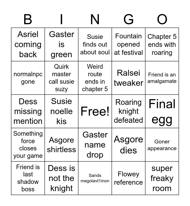 This bingo card has a free space and 24 words: Asgore shirtless, Dess is not the knight, Weird route ends in chapter 5, Friend is last shadow boss, Chapter 5 ends with roaring, Asriel coming back, normalnpc gone, Gaster is green, Roaring knight defeated, Gaster name drop, Ralsei tweaker, Dess missing mention, Asgore dies, Goner appearance, Quirk master call susie suzy, Flowey reference, Final egg, Susie finds out about soul, Friend is an amalgamate, Susie noelle kis, super freaky room, Something force closes your game, Fountain opened at festival and Sands megolavt1inon.