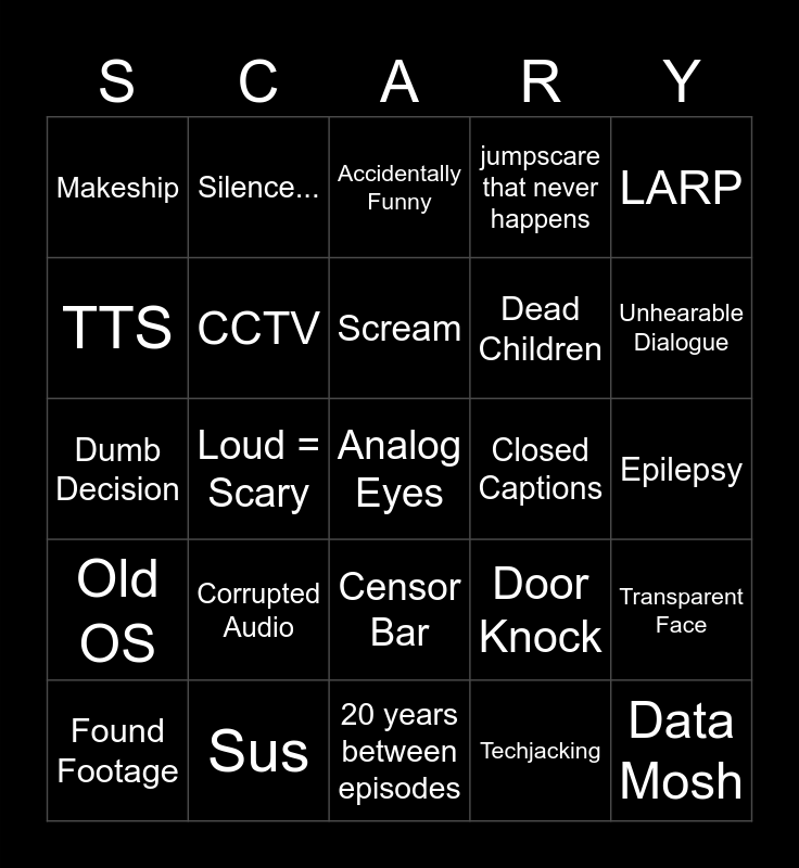 This bingo card has a free space and 29 words: Found Footage, Whispers, Loud = Scary, Unlisted Video, Makeship, Accidentally Funny, CCTV, Corrupted Audio, Closed Captions, Sus, Epilepsy, Data Mosh, 20 years between episodes, Techjacking, Unhearable Dialogue, Phone Call, Censor Bar, Old OS, LARP, Dumb Decision, Door Knock, Encrypted Message, Dead Children, TTS, jumpscare that never happens, Silence..., Transparent Face, Scream and FileName.mp4.