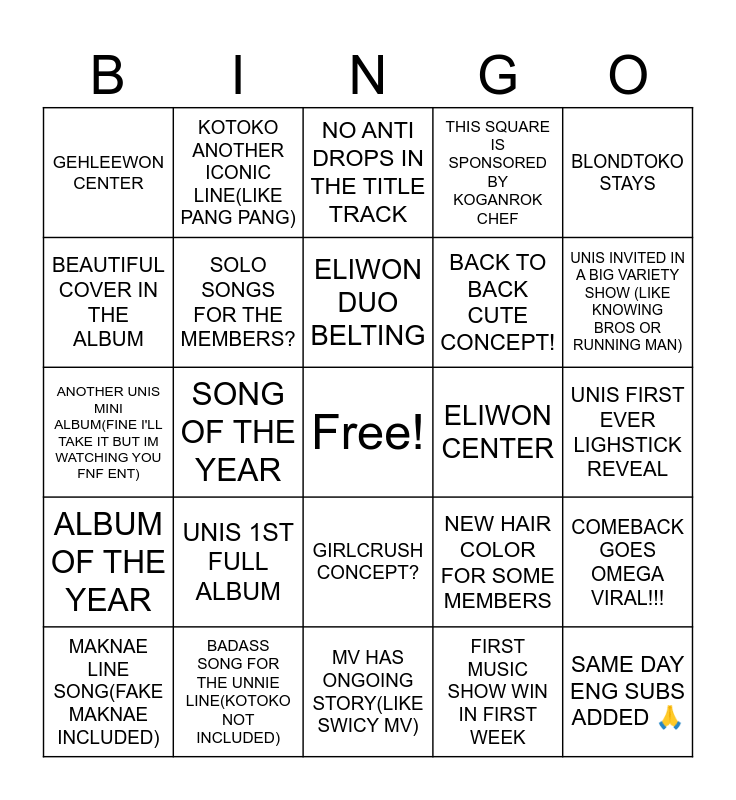 This bingo card has a free space and 24 words: UNIS 1ST FULL ALBUM, BADASS SONG FOR THE UNNIE LINE(KOTOKO NOT INCLUDED), ELIWON DUO BELTING, MAKNAE LINE SONG(FAKE MAKNAE INCLUDED), BLONDTOKO STAYS, GEHLEEWON CENTER, BEAUTIFUL COVER IN THE ALBUM, KOTOKO ANOTHER ICONIC LINE(LIKE PANG PANG), ELIWON CENTER, GIRLCRUSH CONCEPT?, BACK TO BACK CUTE CONCEPT!, ANOTHER UNIS MINI ALBUM(FINE I'LL TAKE IT BUT IM WATCHING YOU FNF ENT), NEW HAIR COLOR FOR SOME MEMBERS, COMEBACK GOES OMEGA VIRAL!!!, SOLO SONGS FOR THE MEMBERS?, FIRST MUSIC SHOW WIN IN FIRST WEEK, UNIS FIRST EVER LIGHSTICK REVEAL, NO ANTI DROPS IN THE TITLE TRACK, UNIS INVITED IN A BIG VARIETY SHOW (LIKE KNOWING BROS OR RUNNING MAN), SONG OF THE YEAR, SAME DAY ENG SUBS ADDED 🙏, ALBUM OF THE YEAR, THIS SQUARE IS SPONSORED BY KOGANROK CHEF and MV HAS ONGOING STORY(LIKE SWICY MV).
