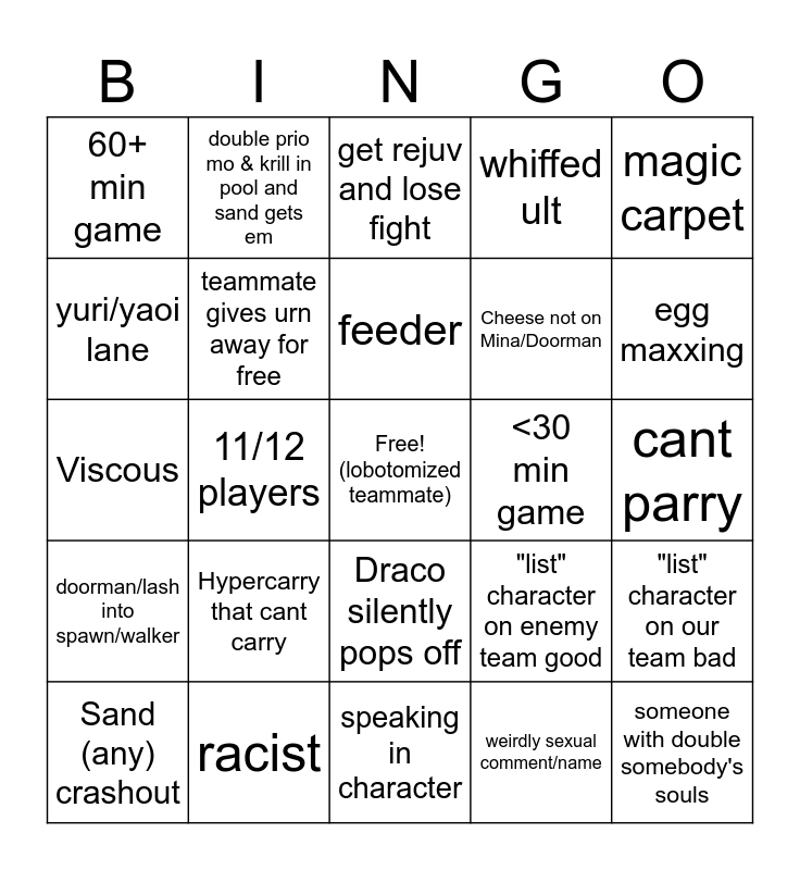 This bingo card has a free space and 24 words: Hypercarry that cant carry, racist, feeder, Sand (any) crashout, magic carpet, 60+ min game, yuri/yaoi lane, double prio mo & krill in pool and sand gets em, <30 min game, Draco silently pops off, Cheese not on Mina/Doorman, Viscous, "list" character on enemy team good, "list" character on our team bad, teammate gives urn away for free, weirdly sexual comment/name, cant parry, get rejuv and lose fight, egg maxxing, 11/12 players, someone with double somebody's souls, doorman/lash into spawn/walker, whiffed ult and speaking in character.