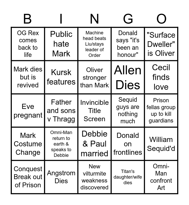 This bingo card has a free space and 24 words: Omni-Man return to earth & speaks to Debbie, Angstrom Dies, Oliver stronger than Mark, Conquest Break out of Prison, "Surface Dweller" is Oliver, OG Rex comes back to life, Mark dies but is revived, Public hate Mark, Sequid guys are nothing much, Debbie & Paul married, Allen Dies, Eve pregnant, Donald on frontlines, William Sequid'd, Kursk features, Titan's daughter/wife dies, Prison fellas group up to kill guardians, Machine head beats Liu/stays leader of Order, Cecil finds love, Father and sons v Thragg, Omni-Man confront Art, Mark Costume Change, Donald says "it's been an honour" and New vilturmite weakness discovered.