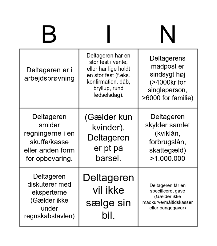 This bingo card has a free space and 8 words: Deltageren skylder samlet (kviklån, forbrugslån, skattegæld) >1.000.000, Deltagerens madpost er sindsygt høj (>4000kr for singleperson, >6000 for familie), Deltageren har en stor fest i vente, eller har lige holdt en stor fest (f.eks. konfirmation, dåb, bryllup, rund fødselsdag)., Deltageren diskuterer med eksperterne (Gælder ikke under regnskabstavlen), Deltageren er i arbejdsprøvning, Deltageren får en specificeret gave (Gælder ikke madkurve/måltidskasser eller pengegaver), Deltageren smider regningerne i en skuffe/kasse eller anden form for opbevaring. and Deltageren vil ikke sælge sin bil..