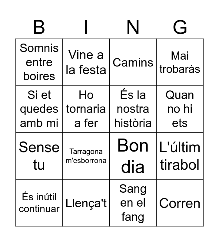 This bingo card has 45 words: Boig per tu, És inútil continuar, El tren de mitjanit, Envia'm un àngel, El Boig de la Ciutat, L'Empordà, Camins, El far del sud, Si et quedes amb mi, Podré tornar enrera, Mai trobaràs, Llença't, Tinc fam de tu, Miami Beach, Més que la meva sang, Trepitja fort, El pagès, Bon dia, Jo vull ser rei, Tarragona m'esborrona, Vine a la festa, Agost, El vol de l'home ocell, Somnis entre boires, El senyor de les pedres, Sang en el fang, On, Puc ser jo, Balla, Corren, No tinguis por, Res tornarà a ser igual, Oxigen, Sóc d'un país, El pesident, L'últim tirabol, Un secret que t'havia de dir, Històries curtes, Els teus ulls glaucs, Quan no hi ets, Ho tornaria a fer, Sense tu, Compta amb mi, És la nostra història and Tota la nit.
