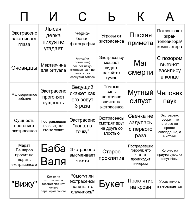 This bingo card has 36 words: Старое проклятие, Экстрасенс высмеивает что-то, Букет, Очевидцы, Сущность прогоняет экстрасенса, Тёмные силы негативно влияют на экстрасенса, Мертвичина для ритуала, "Смогут ли экстрасенсы понять что случилось", Плохая примета, Пострадавшие говорят, что что-то происходит вечером, С позором выгонят василису в конце, Угрозы от экстрасенса, Кого-то из приутствующих зовут Илья, Экстрасенс прогоняет сущность, Экстрасенсу мешает видеть какой-то туман, Экстрасенс закатывает глаза, Марат Башаров просит не верить экстрасенсам, Мутный силуэт, Маловероятное событие, Чёрно-белая фотография, Ведущий скажет как его зовут 3 раза, Пострадавший говорит, что кто-то ходит, Экстрасенсы смотрят друг на друга со злостью, Экстрасенс "попал в точку", Свечка не задулась с первого раза, Лысая девка нихуя не угадает, Маг смерти, Кто то из экстрасенсов говорит, что нет ничего паранормального, Алиса(ии помошник) пошлет нахуй экстрасенса и не ответит на ебанутый вопрос, Показывают экран телевизора/компьютера, Урод много выебывается, "Вижу", Экстрасенс говорит что это все не просто совпадение, а мистики, Человек паук, Баба Валя and Проклятие на крови.