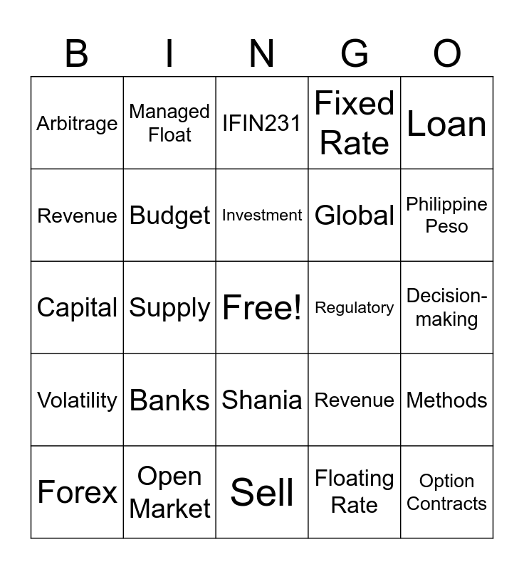 This bingo card has a free space and 74 words: Prof. RR, Group 3, IFIN231, Put Option, Call Option, International, Financial, Management, Forex, Exchange Rate, Interest Rate, Inflation, Investment, Revenue, Economic Risks, Supply, Demand, Philippine Peso, US Dollar, Capital, Budget, Managed Float, Fixed Rate, Forward Contracts, Option Contracts, Cost, Currency Swap, Exchange of Principal, Exchange of Interest, Payment, Loan, Operations, Asset, Export, Strategies, Floating Rate, Government, Foreign Currency, Stability, Buy, Sell, Open Market, Central Bank, Fluctuation, Trade, Arbitrage, Investors, Banks, Corporations, Tax, Accounting, Funds, Decision-making, Financial Management, Vince, Jazmine, Shania, Mercy, Lesson 3, Methods, Global, Political Risk, Volatility, Inflation Disparties, Regulatory, Standard, PH Peso, Strike Price, Revenue, Loans, Lenders, Borrow, Agreement and Company.