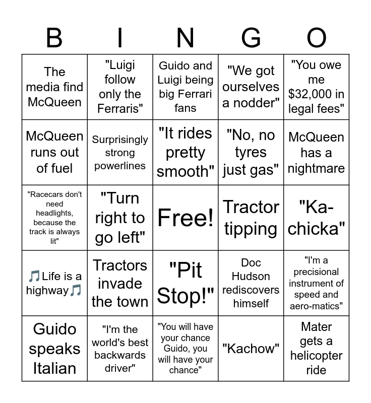 This bingo card has a free space and 34 words: "Speed, I am speed", "Kachow", A113, "Wow, look at that shine", 🎵Life is a highway🎵, Surprisingly strong powerlines, "You owe me $32,000 in legal fees", Guido speaks Italian, "Luigi follow only the Ferraris", "My IQ is dropping by the second", "It rides pretty smooth", Guido and Luigi being big Ferrari fans, "I always got my tow cable, why?", "Great! I'm talking to Bessie now, I'm talking to Bessie!", Tractor tipping, McQueen has a nightmare, "I'm the world's best backwards driver", "Racecars don't need headlights, because the track is always lit", Tractors invade the town, Doc Hudson rediscovers himself, "Pit Stop!", 🎵Life could be a dream🎵, The media find McQueen, "Ka-chicka", "You will have your chance Guido, you will have your chance", Mater gets a helicopter ride, "We got ourselves a nodder", McQueen gets arrested, "No, no tyres just gas", McQueen runs out of fuel, Chick Hicks in Dinoco Blue, "Turn right to go left", "I'm a precisional instrument of speed and aero-matics" and McQueen gets hosed down.