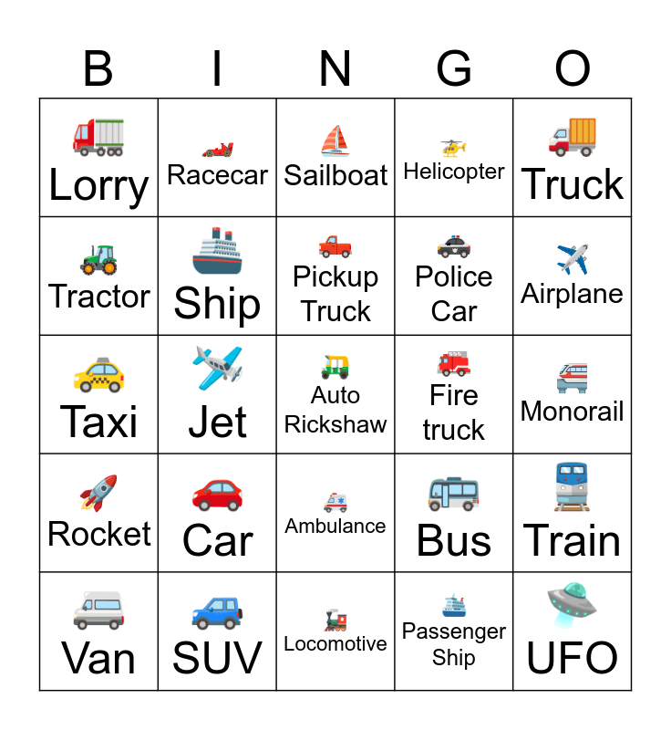 This bingo card has a free space and 24 words: đ Car, đ SUV, đģ Pickup Truck, đ Van, đ Truck, đ Lorry, đ Tractor, đī¸ Racecar, đ Fire truck, đ Ambulance, đ Police Car, đ Taxi, đ Bus, đ Train, đĸ Ship, đŗī¸ Passenger Ship, đ Monorail, âĩ Sailboat, âī¸ Airplane, đŠī¸ Jet, đ¸ UFO, đ Rocket, đ Helicopter and đ Locomotive.