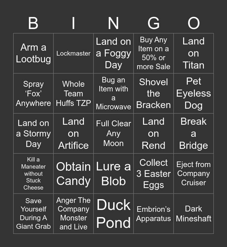 This bingo card has 47 words: Free!, Full Clear Any Moon, Obtain Every Melee Weapon, Duck Pond, Obtain Candy, Obtain two Robot Toys, Lockmaster, Collect >800 Value in a single day, Spray ‘Fox’ Anywhere, Buy Zap Gun, Whole Team Huffs TZP, Buy Any Item on a 50% or more Sale, Eject from Company Cruiser, Collect 3 Easter Eggs, Explode a Jetpack, Sell a Shop Item, Bug an Item with a Microwave, Land on Rend, Land on Dine, Land on Titan, Land on Artifice, Embrion’s Apparatus, Arm a Lootbug, Shovel the Bracken, Trap a Barber behind a Door, Pet Eyeless Dog, Save Yourself During A Giant Grab, Dodge a Worm, Lure a Blob, Kill a Maneater without Stuck Cheese, Hug a Mimic, Kill a Snare Flea by Exiting, Kill a Thumper on Offense, Take Flight with Tulip Snakes, Anger The Company Monster with a Clown/Airhorn, Anger The Company Monster and Live, Break a Bridge, Do The Fire Jump on Offense, Die To Quicksand, Die To Ship Landing, Dark Mineshaft, Land on a Foggy Day, Land on a Stormy Day, Land on an Eclipsed Day, Ladder-Clip into a Kitchen Counter, Clear Quota 3 and Bring an Apparatus to the Secret Spot.