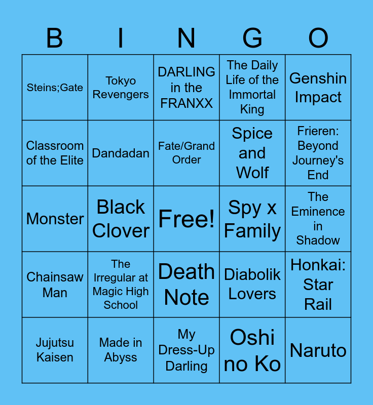 This bingo card has a free space and 24 words: The Irregular at Magic High School, Made in Abyss, Fate/Grand Order, Jujutsu Kaisen, Genshin Impact, Steins;Gate, Classroom of the Elite, Tokyo Revengers, Spy x Family, Death Note, Spice and Wolf, Monster, Diabolik Lovers, Honkai: Star Rail, Dandadan, Oshi no Ko, The Eminence in Shadow, DARLING in the FRANXX, Frieren: Beyond Journey's End, Black Clover, Naruto, Chainsaw Man, The Daily Life of the Immortal King and My Dress-Up Darling.