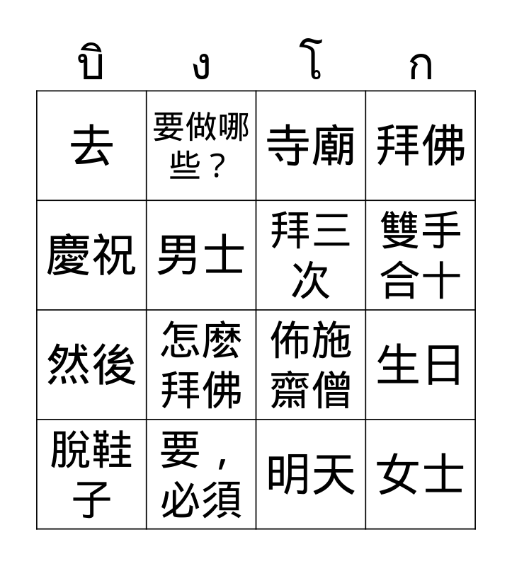 This bingo card has 16 words: 要, 必須, 生日, 寺廟, 去, 然後, 要做哪些?, 佈施 齋僧, 明天, 慶祝, 男士, 脫鞋子, 拜佛, 怎麽 拜佛, 雙手 合十, 拜三次 and 女士.
