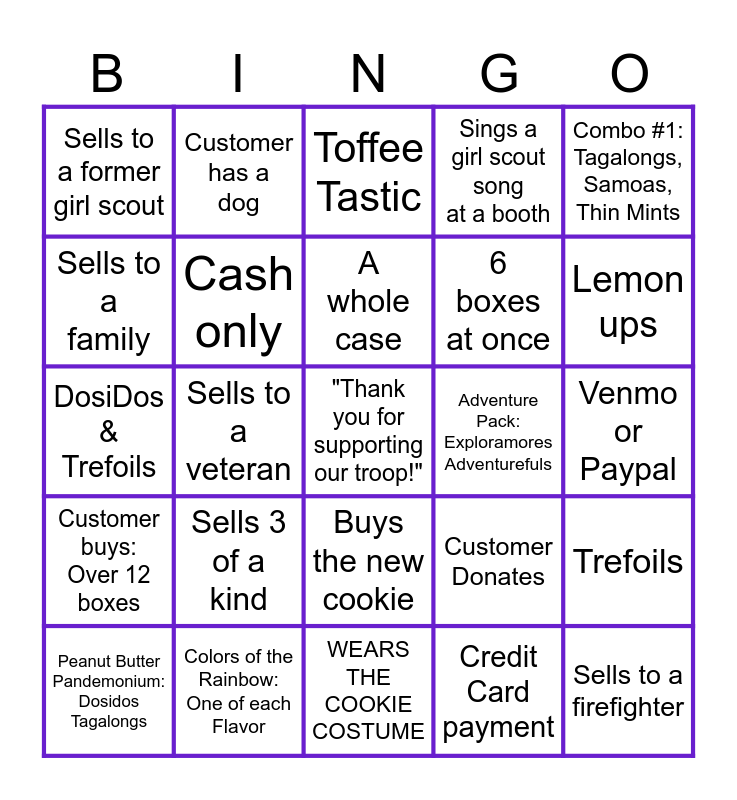 This bingo card has a free space and 24 words: Sells 3 of a kind, Colors of the Rainbow: One of each Flavor, A whole case, Peanut Butter Pandemonium: Dosidos Tagalongs, Combo #1: Tagalongs, Samoas, Thin Mints, Sells to a former girl scout, Sells to a family, Customer has a dog, Adventure Pack: Exploramores Adventurefuls, Buys the new cookie, 6 boxes at once, DosiDos & Trefoils, Customer Donates, Trefoils, Cash only, Credit Card payment, Venmo or Paypal, Toffee Tastic, Lemon ups, Sells to a veteran, Sells to a firefighter, Customer buys: Over 12 boxes, Sings a girl scout song at a booth and WEARS THE COOKIE COSTUME.