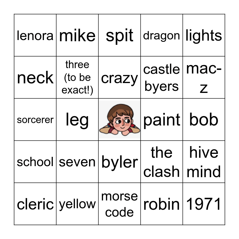 This bingo card has a free space and 24 words: seven, yellow, crazy, cleric, lights, lenora, neck, mike, paint, byler, castle byers, sorcerer, the clash, hive mind, three (to be exact!), robin, bob, spit, mac-z, leg, 1971, school, dragon and morse code.
