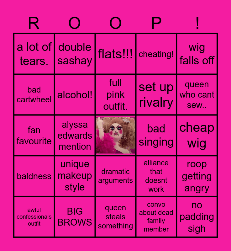 This bingo card has a free space and 24 words: unique makeup style, BIG BROWS, full pink outfit., awful confessionals outfit, wig falls off, a lot of tears., bad cartwheel, double sashay, bad singing, dramatic arguments, set up rivalry, fan favourite, alliance that doesnt work, roop getting angry, alcohol!, convo about dead family member, cheap wig, flats!!!, queen who cant sew.., alyssa edwards mention, no padding sigh, baldness, cheating! and queen steals something.