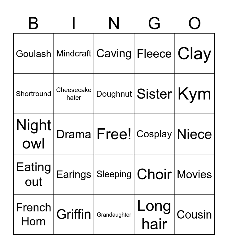 This bingo card has a free space and 24 words: Earings, Griffin, Doughnut, French Horn, Clay, Goulash, Shortround, Mindcraft, Cosplay, Sleeping, Sister, Night owl, Choir, Movies, Cheesecake hater, Long hair, Niece, Caving, Kym, Drama, Cousin, Eating out, Fleece and Grandaughter.