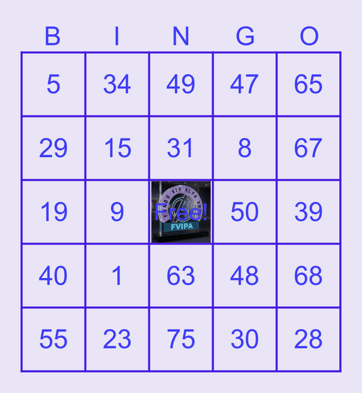 This bingo card has a free space and 24 words: 1, 23, 31, 55, 65, 5, 29, 34, 50, 63, 8, 19, 48, 68, 15, 30, 39, 49, 67, 9, 28, 40, 47 and 75.