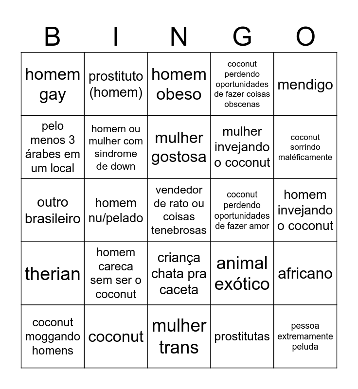 This bingo card has a free space and 24 words: homem careca sem ser o coconut, coconut, mulher gostosa, coconut moggando homens, mendigo, homem gay, pelo menos 3 árabes em um local, prostituto (homem), coconut perdendo oportunidades de fazer amor, criança chata pra caceta, mulher invejando o coconut, outro brasileiro, animal exótico, africano, homem ou mulher com sindrome de down, prostitutas, homem invejando o coconut, homem obeso, coconut sorrindo maléficamente, homem nu/pelado, pessoa extremamente peluda, therian, coconut perdendo oportunidades de fazer coisas obscenas and mulher trans.