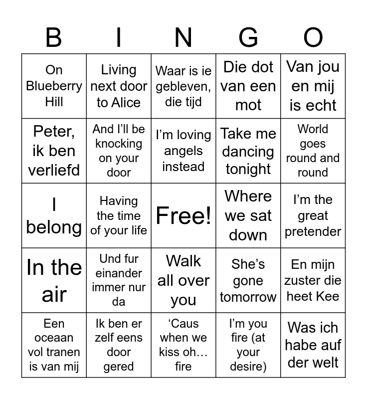 This bingo card has a free space and 46 words: Love is all you need, Was ich habe auf der welt, Ahoeoeoe aweem away, ‘Caus when we kiss oh…fire, Und fur einander immer nur da, Somebody to love, Living next door to Alice, To fix you, Peter, ik ben verliefd, But lay off of my blue suede shoes, And I’ll be knocking on your door, Die dot van een mot, En mijn zuster die heet Kee, She’s gone tomorrow, Kom vanavond bij mij, Ich will dich nicht verlieren, I’m loving angels instead, Where we sat down, Die hoog in de hemel is, Van jou en mij is echt, Having the time of your life, I’m you fire (at your desire), On Blueberry Hill, Take me dancing tonight, En was de schrik der zee, World goes round and round, Een oceaan vol tranen is van mij, Was dancing to the jailhouse rock, Walk all over you, In the air, Never walk alone, Where is the love, Jao, het mag wel zo, Nobody’s wife, You’re never alone, Ik ben er zelf eens door gered, I’m the great pretender, That’s the way it is, Steal her away from me, Just like you, Hoe zijn we hier beland, Waar is ie gebleven, die tijd, I belong, Dan wel met jou, All about that bass and Baila, baila, baila, baila.