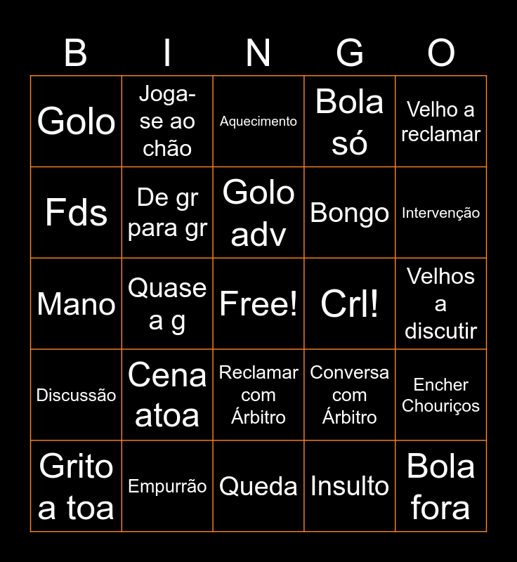 This bingo card has a free space and 25 words: Cena atoa, Queda, Golo adv, Grito a toa, Velho a reclamar, Golo, Fds, Joga-se ao chão, Crl!, Reclamar com Árbitro, Bongo, Mano, Conversa com Árbitro, Encher Chouriços, De gr para gr, Tropeçar, Velhos a discutir, Aquecimento, Intervenção, Quase a g, Bola fora, Empurrão, Discussão, Bola só and Insulto.