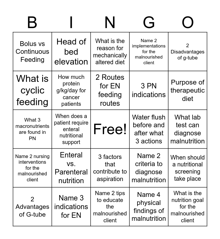 This bingo card has a free space and 24 words: Enteral vs. Parenteral nutrition, Name 3 indications for EN, 2 Routes for EN feeding routes, 2 Advantages of G-tube, 2 Disadvantages of g-tube, Bolus vs Continuous Feeding, What is cyclic feeding, Head of bed elevation, Water flush before and after what 3 actions, 3 factors that contribute to aspiration, 3 PN indications, What 3 macronutrients are found in PN, Name 2 criteria to diagnose malnutrition, When should a nutritional screening take place, How much protein g/kg/day for cancer patients, Name 4 physical findings of malnutrition, What lab test can diagnose malnutrition, What is the reason for mechanically altered diet, Purpose of therapeutic diet, When does a patient require enteral nutritional support, What is the nutrition goal for the malnourished client, Name 2 nursing interventions for the malnourished client, Name 2 implementations for the malnourished client and Name 2 tips to educate the malnourished client.